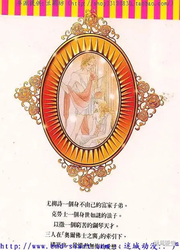 奥尔佛士之窗漫画 ,经典巨作《奥尔佛士之窗》(又译《奥尔菲斯之窗》,《俄耳甫斯之窗》) 1975年开始连载於《稚菊周刊》,1980年获得第九届日本漫画家协会优秀奖在这部架构浩大的爱情悲剧里,无法挣脱命运的枷锁与个人对命运的反抗构成了故事的核心。情节哀婉动人,画面恢弘华美,欧风浓郁,心理描写出色,是比《凡尔赛玫瑰》更为成熟之作。 20世纪初,圣塞巴斯汀天主教会的附属音乐学校里有一扇古老的窗子,被称为奥尔佛士之窗。相传站在那扇窗前,将会和第一位映入眼帘的女性坠入一段宿命的悲恋。转校生钢琴系的以撒和尤柳诗,以及小提琴系的克劳士在此开始宿命般的邂逅。 三个年轻人有着不同的身世背景:尤柳诗生为贵族,家人因庞大的财产继承权而勾心斗角; 以撒家境贫寒,努力成为一流的钢琴家; 克劳士是一名俄国革命家,因其兄谋反被杀而逃亡德国。 女主角作为德国三大家族的继承人,从小就被其母亲以私生子的身份养大成人。女扮男装的她英姿勃发兼貌美绝伦,就读於音乐学校。 在家族的恩怨与阴谋中,在音乐学校度过的快乐时光中,友情与爱情悄然滋生。 随着一战爆发,俄国大革命的开始,三个人为了各自的理想与信念,逐步走上各自不同的人生……